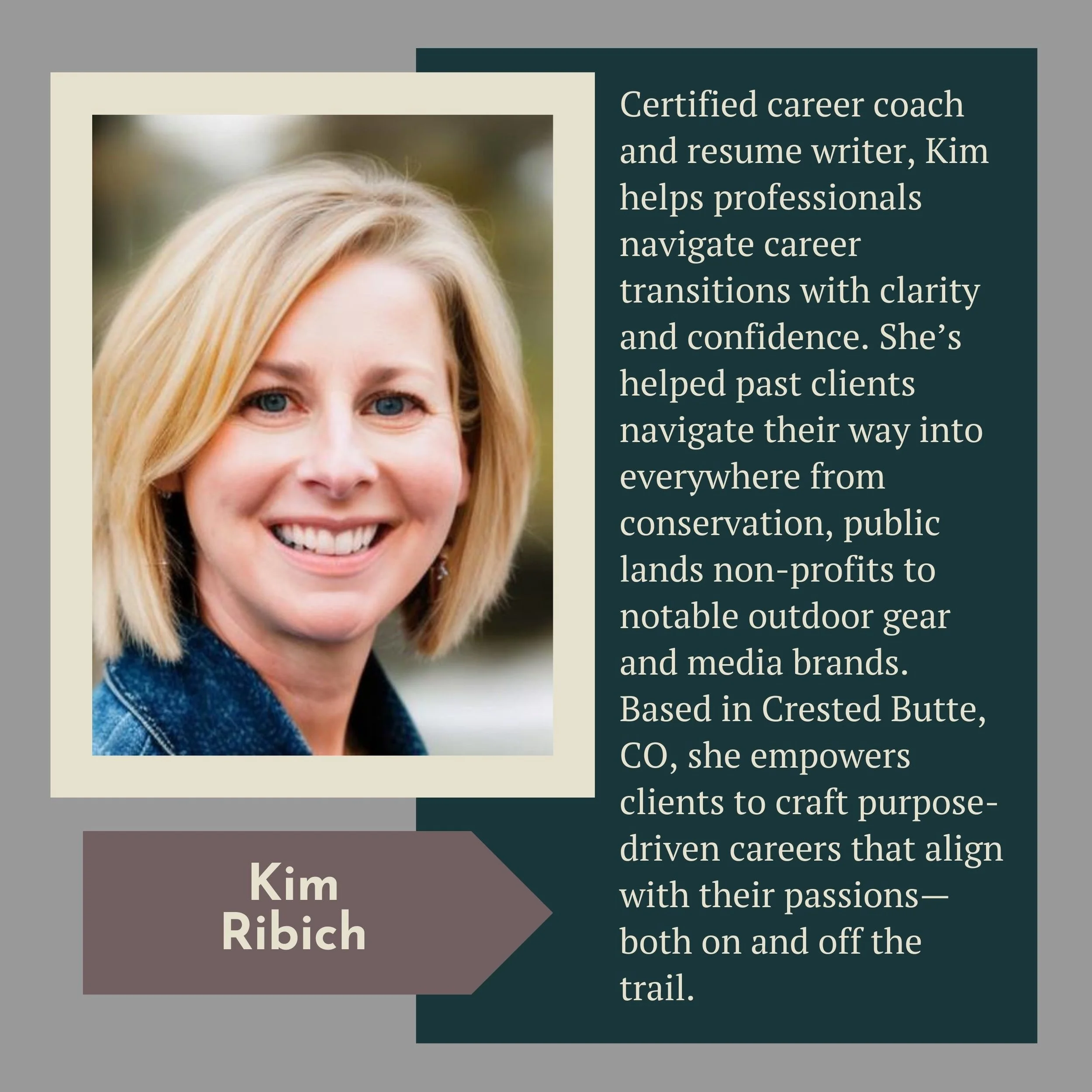 Believing there’s no one “right” career path and that every experience is valuable if we learn and grow from it, Kim helps clients of all ages and stages claim their unique experiences, connect the dots, and take charge of their professional narratives. Known for her empathetic approach, Kim prepares clients for new adventures by designing individualized roadmaps, creating standout resumes, cover letters, and online profiles, and boosting networking and interviewing success. With a psychology background and experience navigating dozens of her own career plot twists, she’s worked across nonprofit, corporate, higher ed, and entrepreneurial sectors before arriving at her true calling – 1:1 coaching. She resides in the outdoor wonderland of Crested Butte, CO, with her husband and their four-legged legend, Magnus.